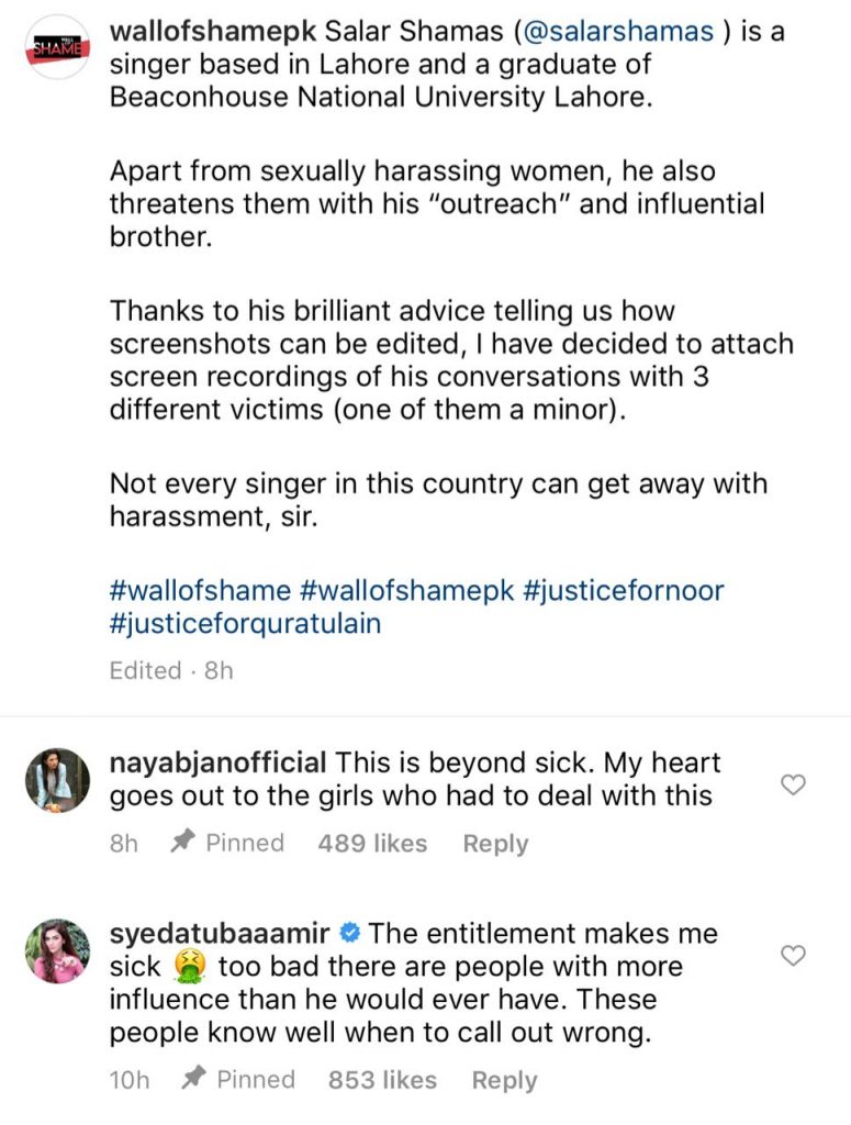 She claimed that Ayyy Tere Bin singer Salar Shamas assaulted her in a drunk state and later threatened her of his influence and privileged background.