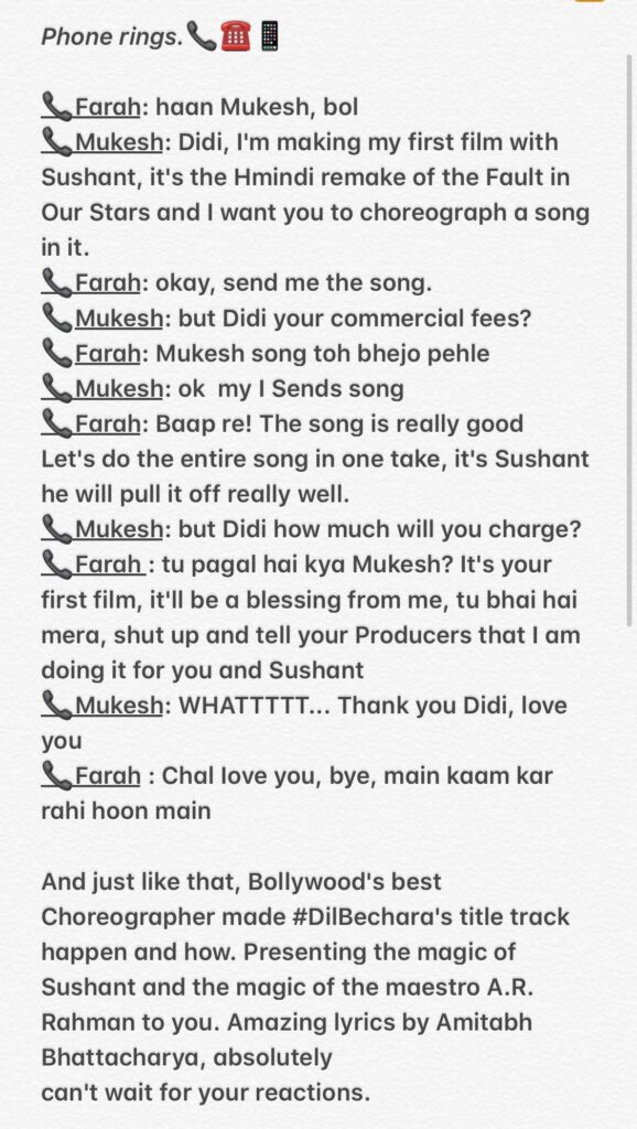 “This song is particularly close to me because it was the first time I was choreographing Sushant,” said the award-winning choreographer. “We were friends for a long time but never worked together. I had also promised Mukesh that when he makes his directorial debut I would do a song for him.”