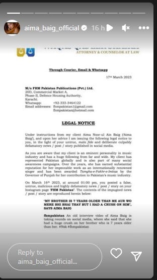 The ‘Washmallay’ singer then shared clips of the defamation notice she has sent to FMH Pakistan for posting a story that was “false, untrue, malicious and highly defamatory.”