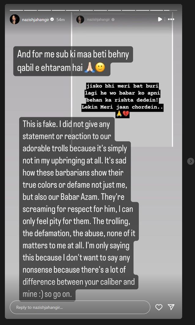 The actress has confirmed that the screenshot is fake. She shared an Instagram story saying, “This is fake. I did not give any statement or reaction to our adorable trolls because it’s simply not in my upbringing at all. It’s sad how these barbarians show their true colors or defame not just me, but also our Babar Azam.”