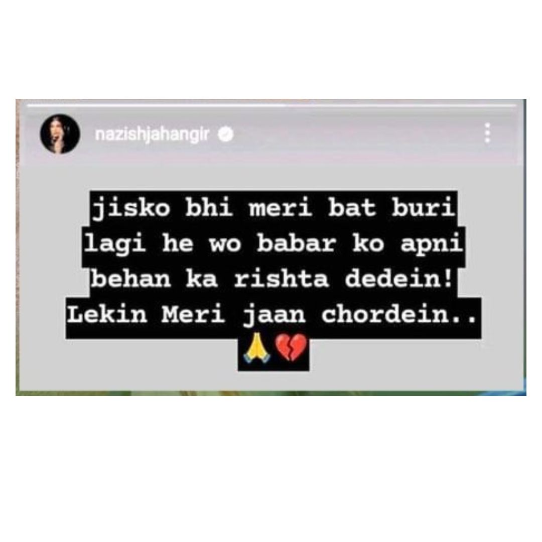 A screenshot is circulating on social media in which Nazish Jahangri wrote on her Instagram story, “Jisko meri bat buri lagi ho wo Babar ko apni behn ka rishta de dein lekin meri jan chor dein”.