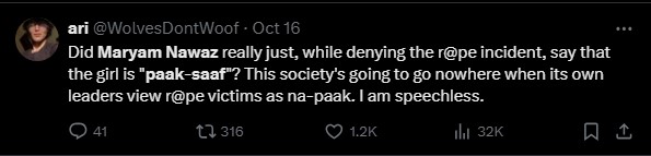 Another tweeter user opined, “Did Maryam Nawaz really just, while denying the r@pe incident, say that the girl is “paak–saaf“? This society’s going to go nowhere when its own leaders view r@pe victims as na-paak. I am speechless.”