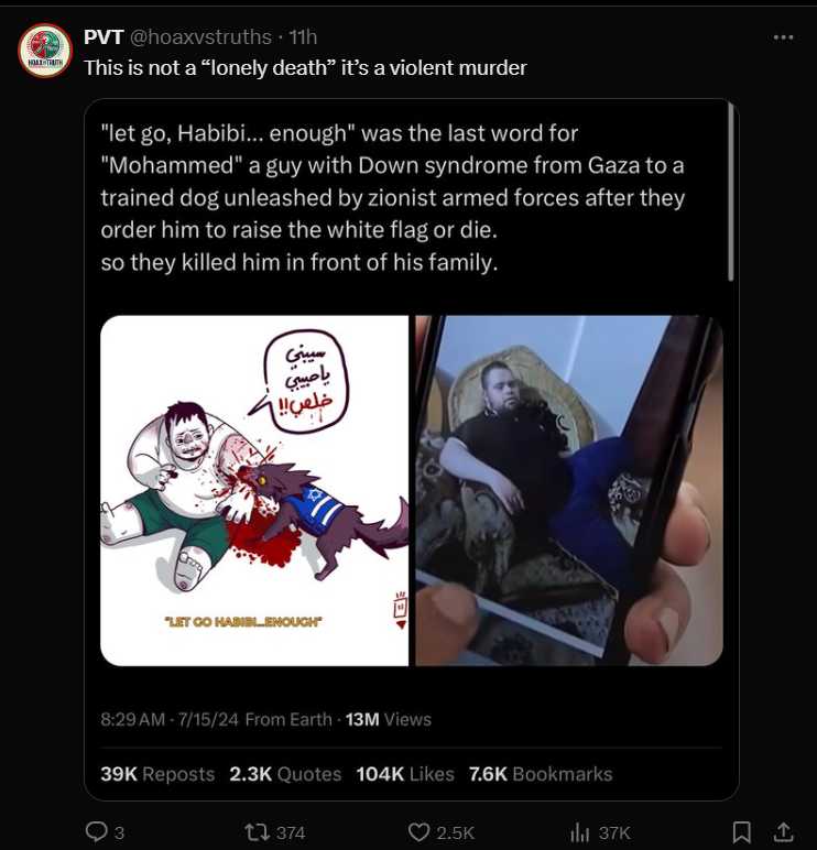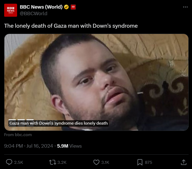 However, the caption on X said, “The lonely death of Gaza man with Down’s Syndrome.”