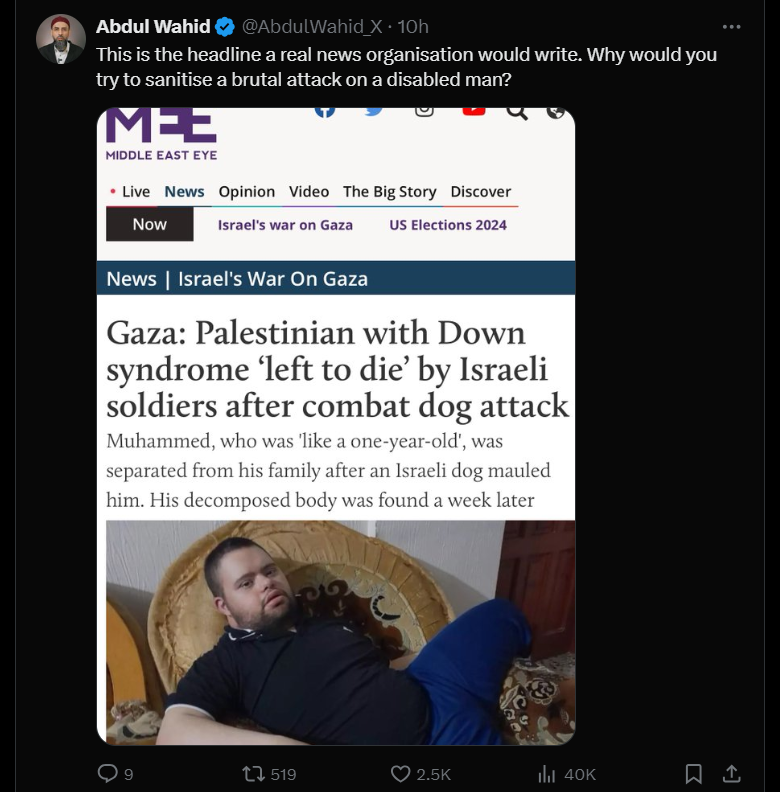 A user quoted Middle East Eye for its appropriate headline, saying, “Gaza: Palestinian with Down syndrome ‘left to die ‘ by Israeli soldiers after combat dog attack.” The tweet read, “This is the headline a real news organisation would write. Why would you try to sanitise a brutal attack on a disabled man?”