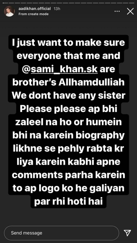 “We don’t have any sister. Please please aap bhi zaleel na ho or humein bhi na karein, biography likhne se pehly rabta kr liya karein. Kabhi apne comments parha karein to aap logo ko he galiyan par rhi hoti hai,” he added.