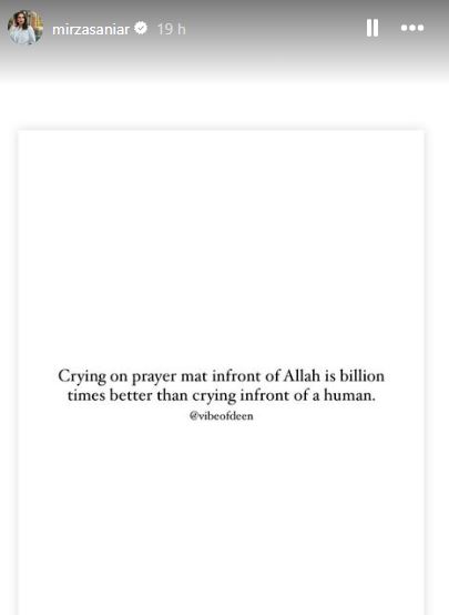 She posted a story with the caption, “Crying on prayer mat in front of Allah is billion times better than crying in front of a human.”