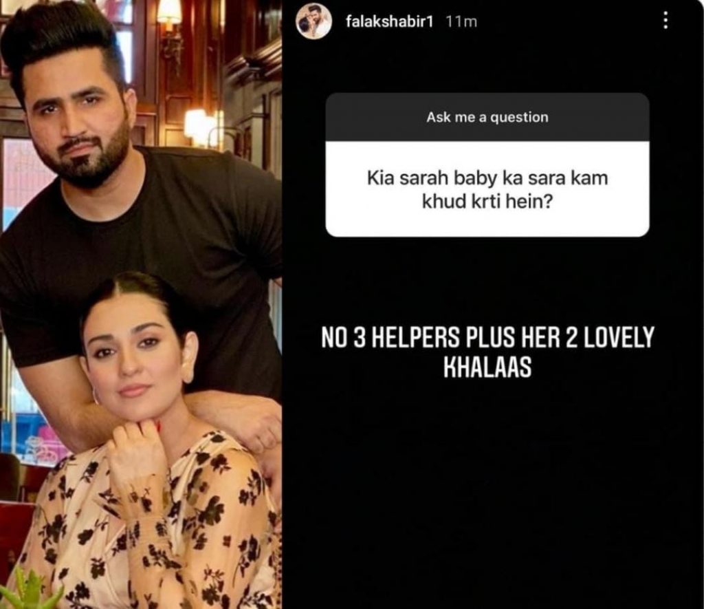 Singer Falak Shabir has revealed that he and wife Sarah Khan has hired multiple helpers for daughter Alyana’s baby sitting. During a ‘Question and Answer’ session on Instagram a netizen asked Falak that “Kia Sarah baby ka sara kam khud krti hein?”