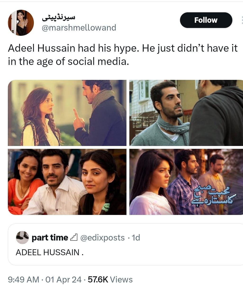 Getting lots of love on X (formely Twitter), one fan shared four pictures of Adeel Hussain from different roles and said, “Adeel Hussain was special. He just didn’t have social media back then.”