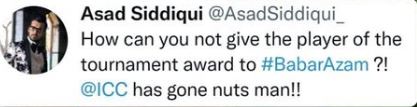 Actor Asad Siddiqui has lashed out at International Cricket Council (ICC) for not naming the captain of Pakistan Cricket team Babar Azam, as the player of the tournament.