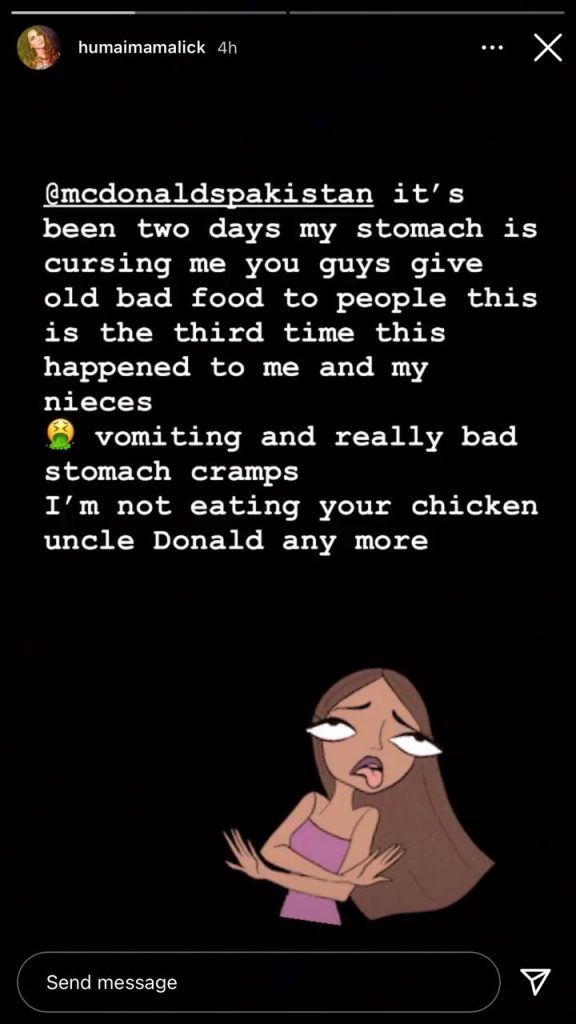 Taking to Instagram stories, the Bol star addressing Mc Donalds, wrote: “It’s been two days my stomach is cursing me. You guys give old bad food to people. This is the third time this happened to me and my nieces.”