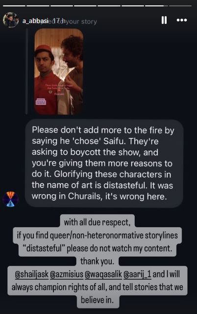 Asim Abbasi shared a picture of the show on his Instagram story, where a person replied saying, “Please don’t add more to the fire by saying he ‘chose’ Saifu. They’re asking to boycott the show, and you’re giving them more reasons to so it. Glorifying these characters in the name of art is distasteful. It was wrong churails, its wrong here.”