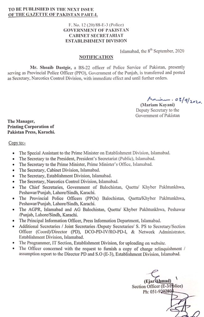 Shoaib Dastagir has now been posted as Secretary Narcotics Control Division according to an official notification.