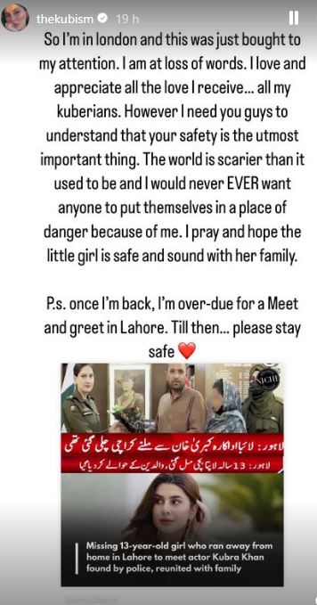 Kubra Khan was informed about the incident in London. She posted a story on her Instagram account about the incident: “So I’m in London, and this was just brought to my attention. I am at a loss of words. I love and appreciate all the love I receive from all my Kuberians. However, I need you guys to understand that your safety is the utmost important thing. The world is scarier than it used to be and I would never EVER want anyone to put themselves in a place of danger because of me. I pray and hope the little girl is safe and sound with her family. P.S. . once I’m back, I’m over-due for a Meet and greet in Lahore. Till then… please stay safe.”