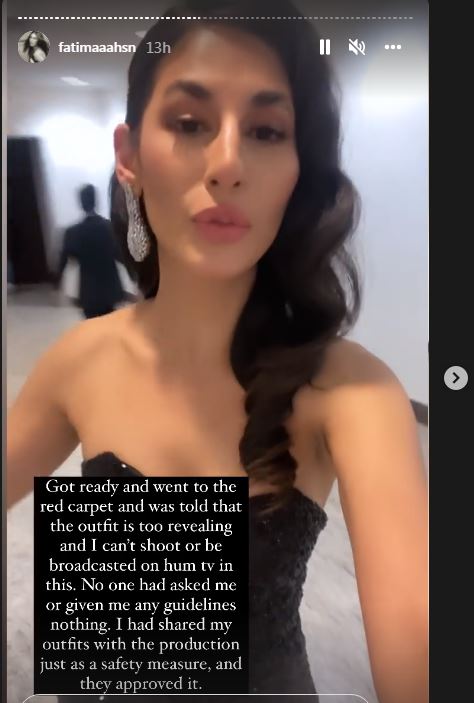 “Got ready and went to the red carpet and was told that the outfit is too revealing and i can’t shoot or be broadcasted on Hum Tv in this.”
