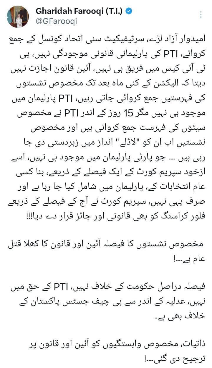 Journalist Gharidah Farooqi posted, “PTI is not present in the parliament, but they have to submit a list of their candidates for reserved seats in the next 15 days as per the court’s orders.”