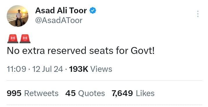 The famous journalist Asad Toor wrote in a post on X, “No extra seats for government.”