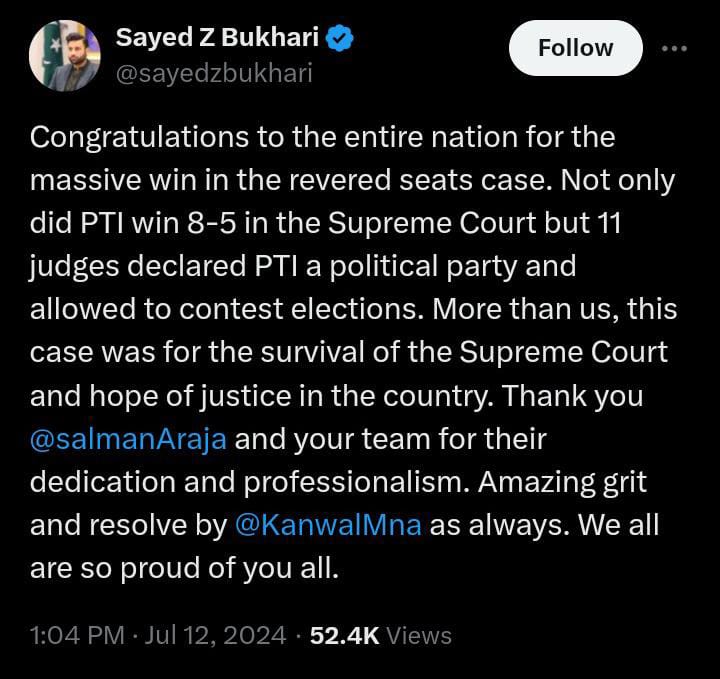 Prominent party leader, Zulfi Bukhari posted, “Congratulations to the entire nation for the massive win in the revered seats case. Not only did PTI win 8-5 in the Supreme Court but 11 judges declared PTI a political party and allowed it to contest elections. More than us, this case was for the survival of the Supreme Court and hope of justice in the country.”