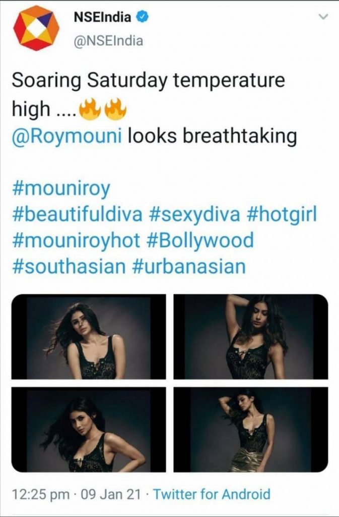The post, which remained on the NSE handle for seven hours, showed Roy in a black sleeveless top with hashtags like “#sexydiva”, “#hotgirl” and “#mouniroyhot”.