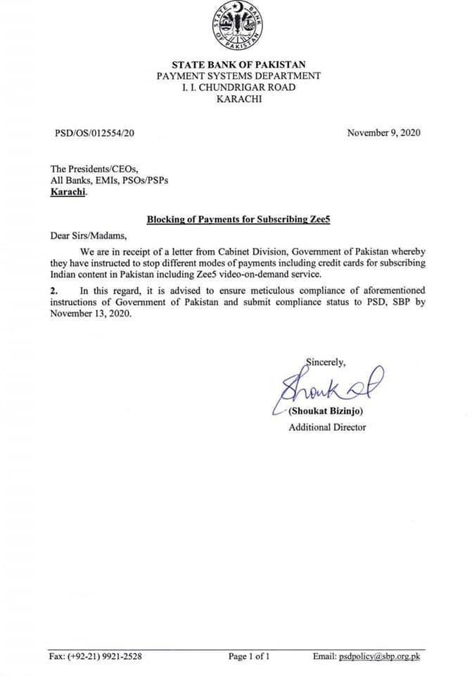 The State Bank of Pakistan has ordered all banks to block Pakistani users from subscribing to Indian streaming platform Zee5 with immediate effect, according to a notification issued this week.