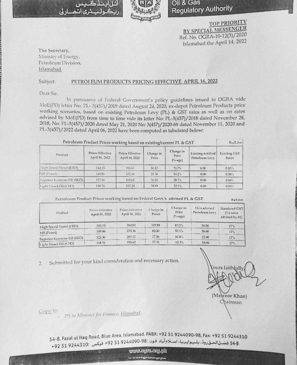 Earlier, OGRA suggested to the Finance Division that the price of petrol be increased by Rs21.50 and that of diesel be hiked by Rs51.30 in view of the current petroleum levy and general sales tax (GST).