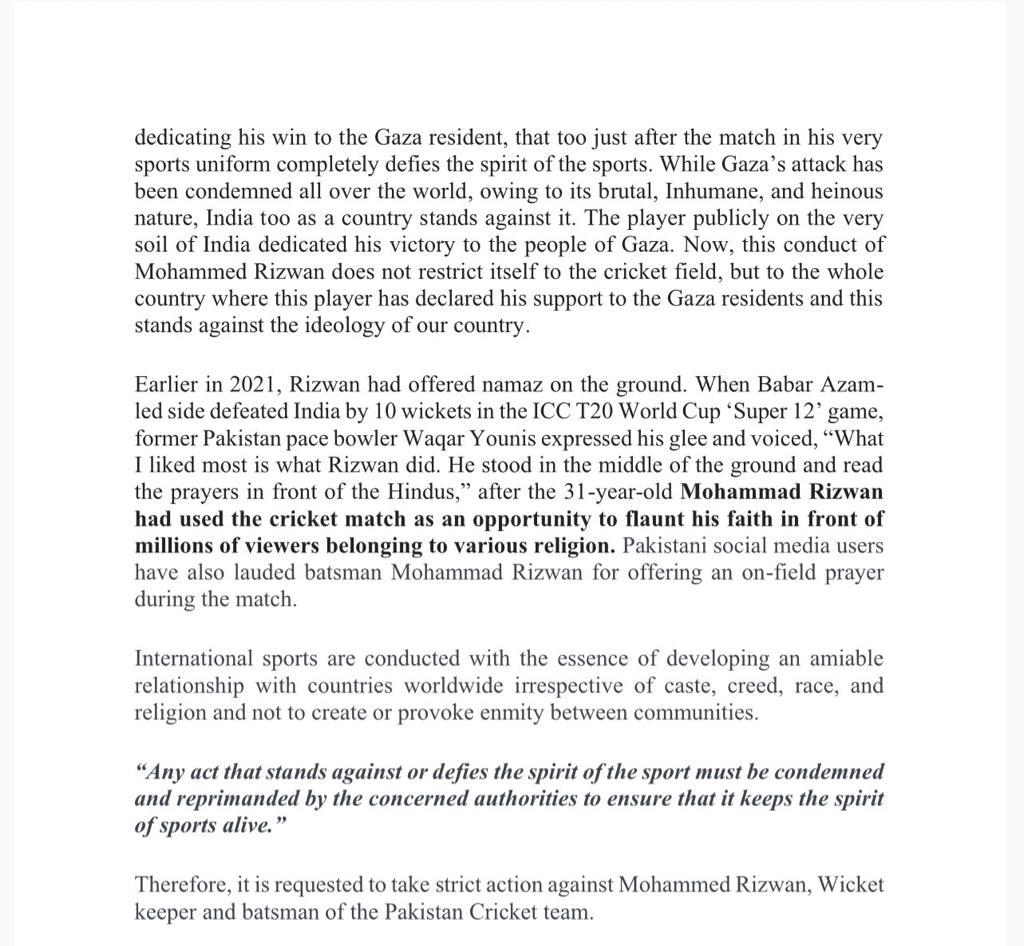 Jindal has written a complaint against Rizwan to Greg Barclay, the head of the International Cricket Council (ICC) for offering prayers on the field.