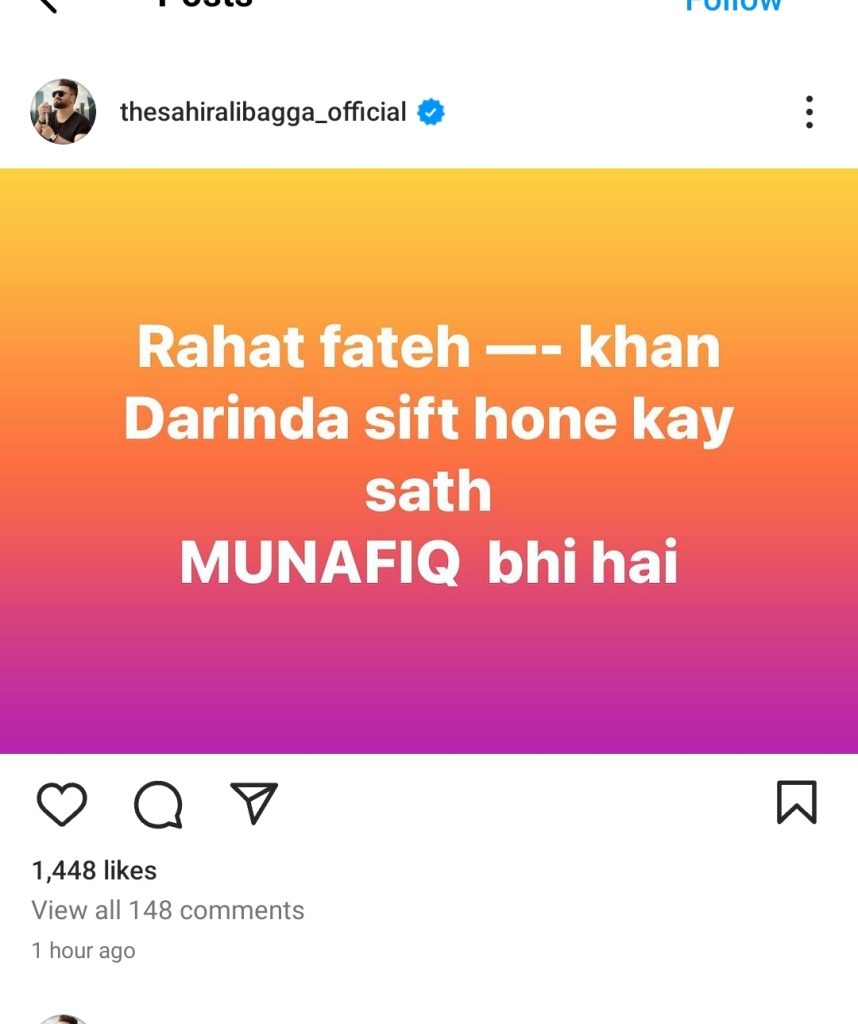 The singer has shared a post on Instagram stating, “Rahat Fateh Ali Khan is the biggest hypocrite and a brutal person -Khuda ki lanat ho munafiq pe Rahat Fateh — Khan Darinda sift hone kay sath MUNAFIQ bhi hai”.