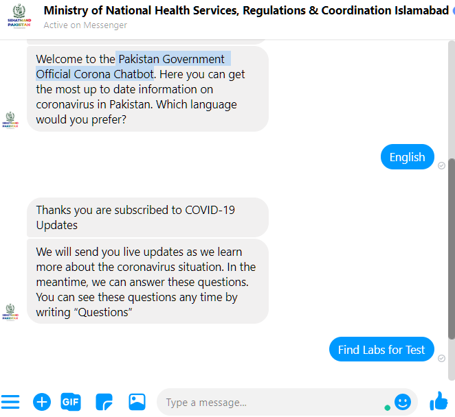 The chat system named ‘Pakistan Government Official Corona Chatbot’ can be accessed through the Facebook page of the Ministry of National Health Services, Regulations & Coordination.