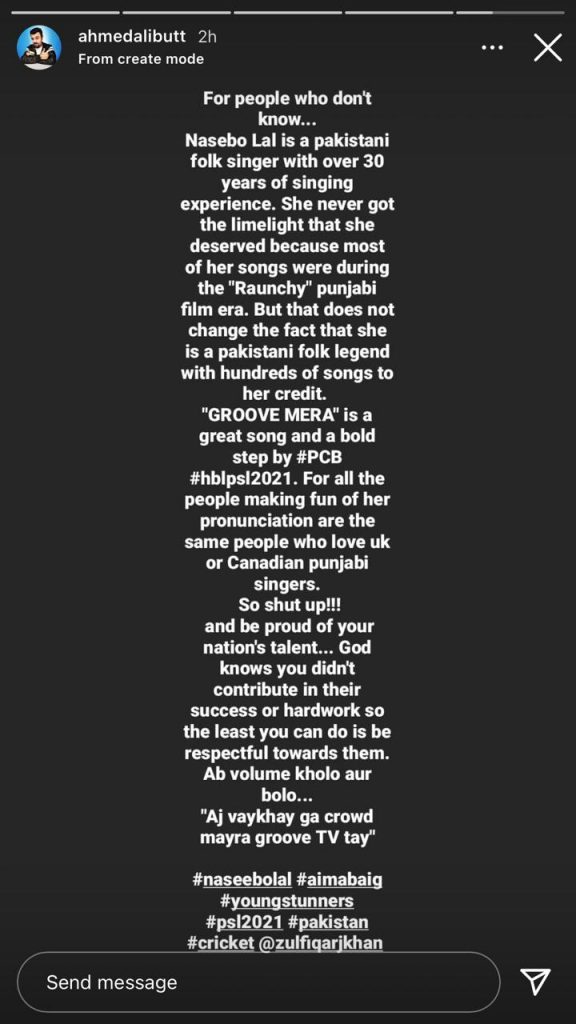 “Groove Mera is a great song and a bold step by PCB. For all the people making fun of her pronunciation are the same people who love UK or Canadian Punjabi singers,” he said further. “So shut up and be proud of your nation’s talent. God knows you didn’t contribute to their success or hard work, so the least you can do is be respectful towards them.”