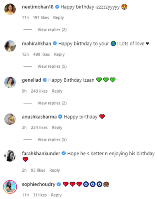 “Happy birthday to your world! Lots of love,” Mahira Khan wrote. “Happy Birthday,” Anushka wrote. “Happy Birthday Izhaan,” Genelia D’Souza wrote.