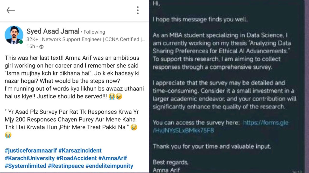 Amna did her MBA from Karachi University. In one of her colleagues’ social media posts, she said that she specialized in Data Science. Her last text is being shared widely, in which she referred to herself as an MBA student asking to fill out a survey for her thesis.