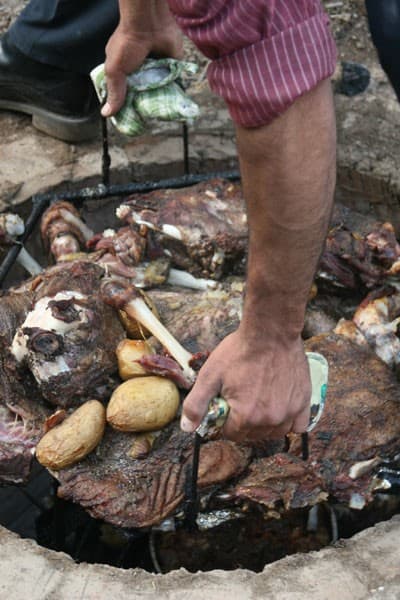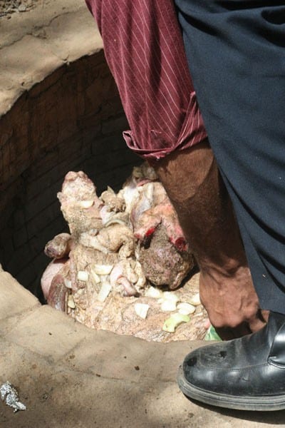 In the Middle East, special takes time but minimal effort. An age-old way to cook goat meat, a method that involves underground ovens and whole goats, still practiced in Arab countries, especially Jordan and Palestine. A skinned goat, with its head intact, is made to sit on a bed of potatoes and vegetables on a large silver platter and slowly lowered into the ground, into an oven with hot coals.