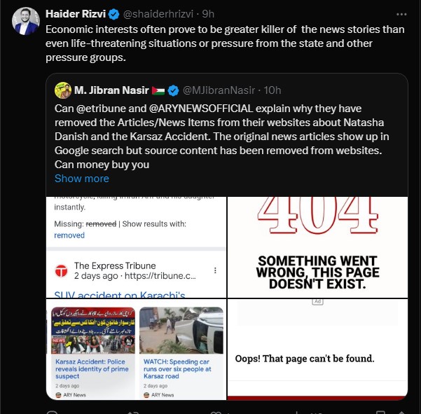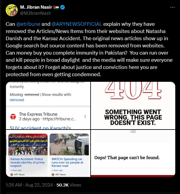 Jibran posted on X (formerly Twitter) “Can @etribune and @ARYNEWSOFFICIAL explain why they have removed the Articles/News Items from their websites about Natasha Danish and the Karsaz Accident. The original news articles show up in Google search but source content has been removed from websites.”
