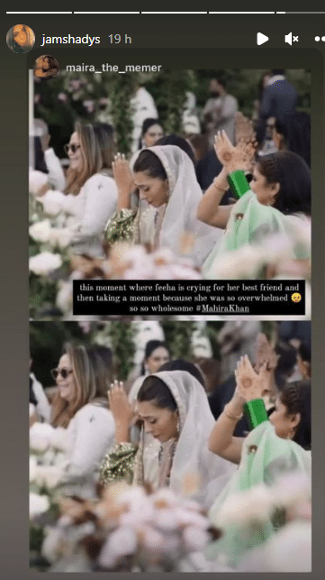 One of Mahira’s closest childhood friends, fashion designer Feeha Noor Jamsheed, posted a screenshot shared by a celebrity account of Mahira’s wedding video where she was seen crying.